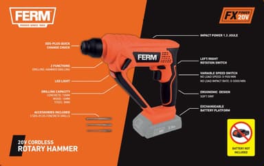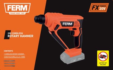 ProduktbeskrivelseFERM HDM1052 er en kraftfuld 20V borehammer designet til boring og hamring i beton, sten, træ og stål. Med en slagkraft på 1.3 Joule og op til 5000 slag/min, klarer den selv de hårdeste vægge og lofter.Læs mere om produktet