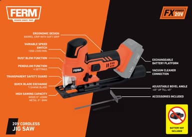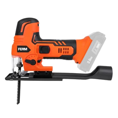 FERM JSM1040 er en kraftfuld og ledningsfri stiksav til 20V batterier fra FERM AX- og FX-Power platformene. Med 4 pendelindstillinger, variabel hastighed (1000–2300/min) og justerbar savvinkel (0–45°) er den ideel til præcise snit i både træ og metal.