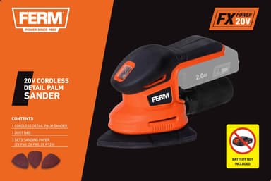FERM PSM1033 er en alsidig og kraftfuld 20V akku palm slibemaskine, perfekt til slibning af træ, metal og plast. Med en hastighed på 10.000 omdrejninger/min og en excentricitet på 1 mm leverer den flotte og jævne resultater – selv på vanskelige overflader.