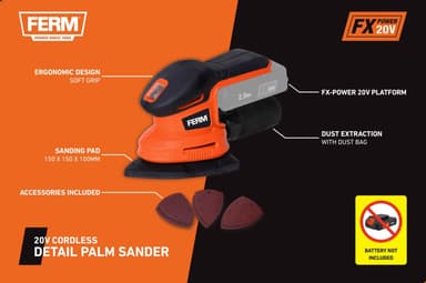 Maskinen er udstyret med softgrip, støvudsugning og en blæsefunktion, som sikrer et rent og behageligt arbejdsmiljø. Sandpapir fastgøres nemt med klittenbånd, og maskinen er kompatibel med alle FERM AX- og FX-Power batterier og ladere.