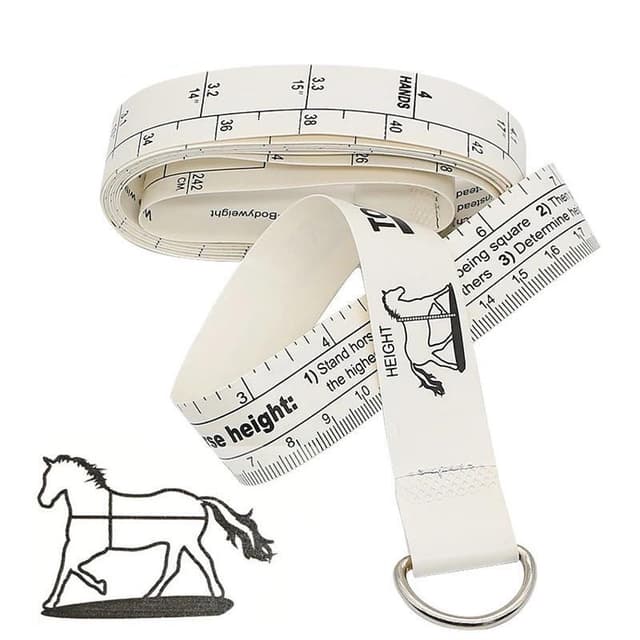 Den ene side af målebåndet anslår hestens vægt i både pounds og kilogram, ryggen måler højden, tydeligt og præcist. Placer målebåndet rundt om hesten i saddelstilling, læs hvor båndet mødes.