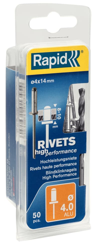High Performance Aluminium nitter Størrelse: Ø4,0 x 14 mm. Antal: 50 stk. Inkl. bor Til: RP10 , RP40, RP60, RP100 Applikationer: Nummerplader, stænklapper, metal og plastovertræk, navneskilte, metalplader, reparationLæs mere om produktet