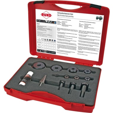 12-delt skruehulstansesæt , 7 skruehuller diameter 16,5 (M 16) - 20,4 (M 20 / PG 13,5) - 25,4 (M 25) - 32,5 (M 32) - 40,5 (M 40) - 50,5 (M 50) + 63,5 mm (M 63) + 1 pladebælbor HSS str. 2 + 1 skærepasta 30 g + 1 trækskrue MF 10 x 1,0 x 45 + 1Læs mere om produktet