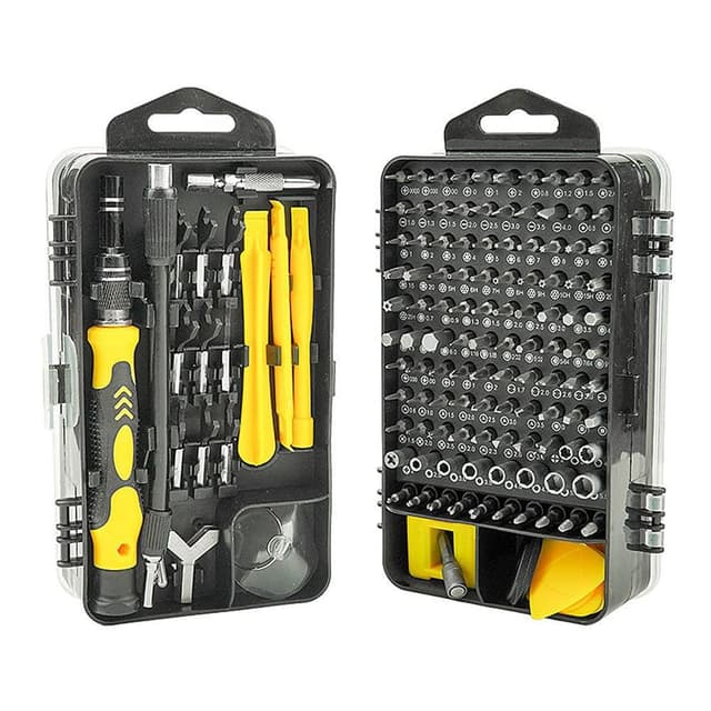 Skruetrækkersættet indeholder et håndtag og 110 batchhoveder og andet vigtigt tilbehør. Den har alt hvad du skal bruge til at reparere bærbare computere, ure, briller osv. Organiseret i en praktisk æske.