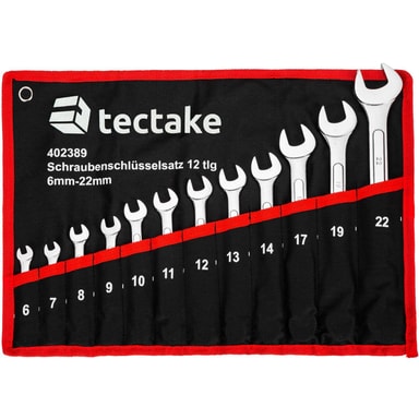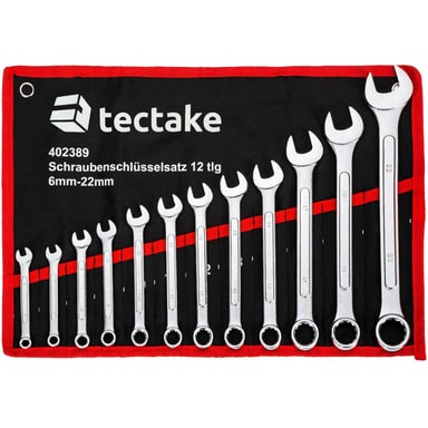 Skruenøglesættet i høj kvalitet består af 12 forskellige gaffel- og ringnøgler. Med sættet har du altid den rigtige skruenøgle ved hånden. Vores skruenøglesæt bliver leveret med en praktisk taske, så hver skruenøgle har sin plads. tasken har en hank, så du kan hænge sættet praktisk på væggen. Bestil skruenøglesættet fra tectake allerede i dag.
