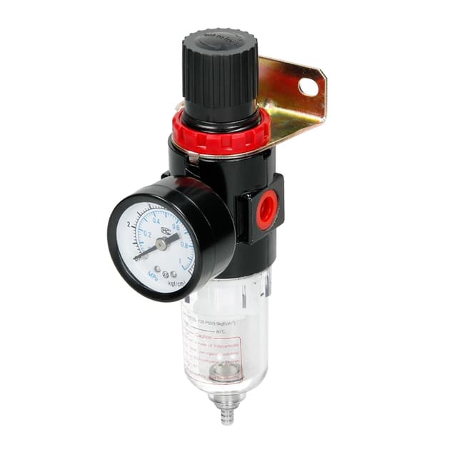 Funktioner egnet til hver kompressor Indhold: vand, trykregulator, manometer Beskrivelse Vand, trykregulator og trykmåler for komprimeret luft værktøjer i én enhed. Denne vandudskiller med manometer forlænger levetiden af ??din luft værktøjer betydeligt. Separatoren er egnet til hver kompressor og et absolut must for en optimal arbejdsresultater. Kondensat direkte indsat og opsamlet i beholderen og kan drænes ved ventilen. Vedligeholdelsen er monteret direkte nedstrøms for kompressoren eller i linjen. Hjælp af aftagelige holdebeslaget, enheden direkte til væggen eller lignende fastgøres.
