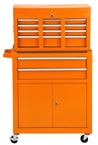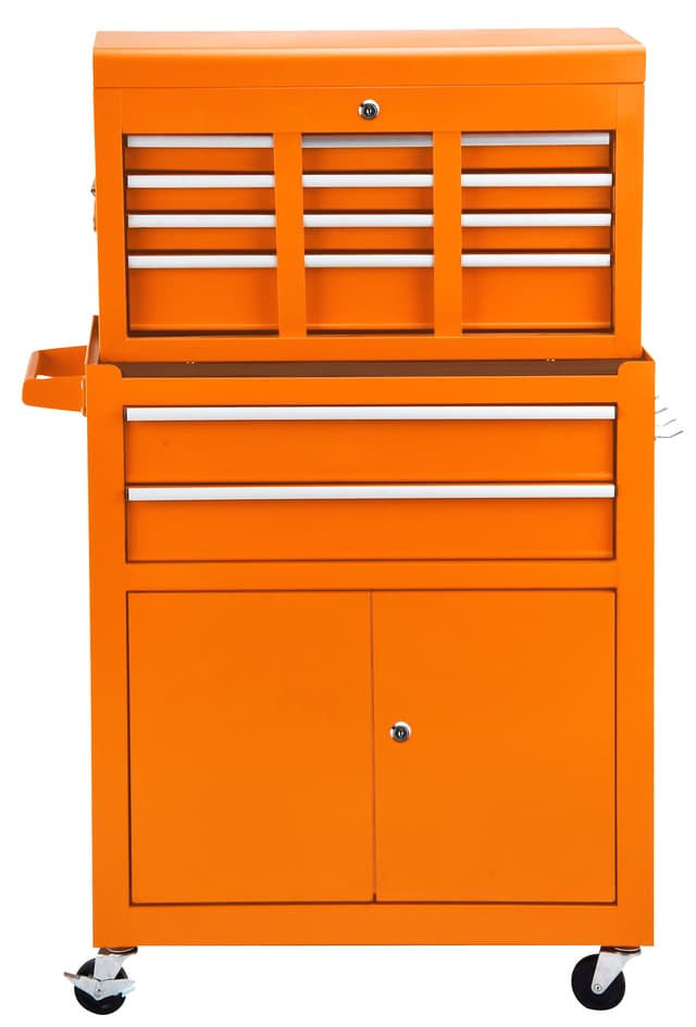Værktøjsvogn med aftageligt topkabinet med bærehåndtag Med i alt 14 skuffer med kuglelejer og alugreb samt aflåselige skabslåger Forsynet med 4 stk Ø1""×3"" drejelige hjul, heraf 2 med bremse Orange pulverlakeret overflade med Work>it-logo Dimensioner: B = 625 mm. D = 330 mm. H u. top = 740 mm. H m. top = 1.070 mm.