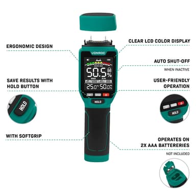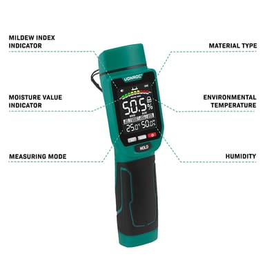 VONROC Fugtmåler 2-i-1 | PRO | Præcis måling af fugt i træ og byggematerialer | LCD display | temperatur- og fugtmåling