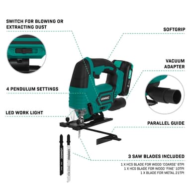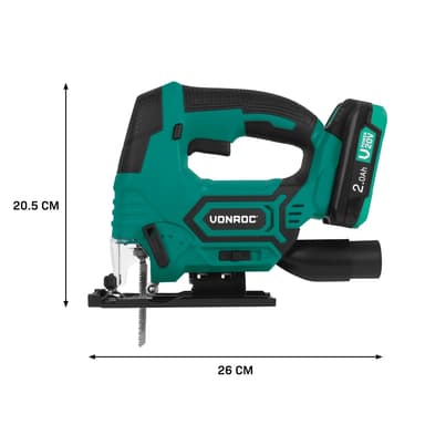 VONROC Stiksav | kompakt & kraftfuld | 2700 o/min | -45° til 45° geringsvinkel | Inkl. 2x 2.0Ah akku og oplader, Parallelanslag & 3 savklinger