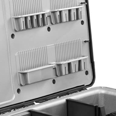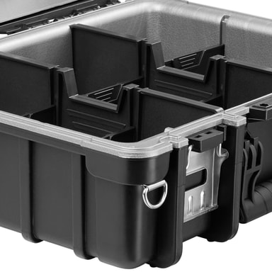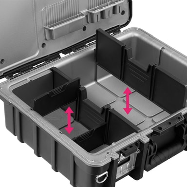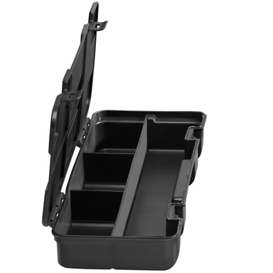 Et modstandsdygtigt kabinet af plast, der er let at vedligeholde, afrundede kanter og stabilt håndtag er blot de ydre fordele ved denne kompakte universalboks fra tectake. Indvendig i transportkufferten muliggør de integrerede holdere i låget nem og hurtig adgang til de ofte benyttede værktøjer. Takket være de fleksibelt anvendelige skillevægge og den udtagelige sortimentskasse kan det indvendige rum opdeles, som man har lyst. Øskener til fastgørelse af en rem samt en anordning til anbringelse af en hængelås afrunder de alsidige anvendelsesmuligheder for denne transportkuffert.
