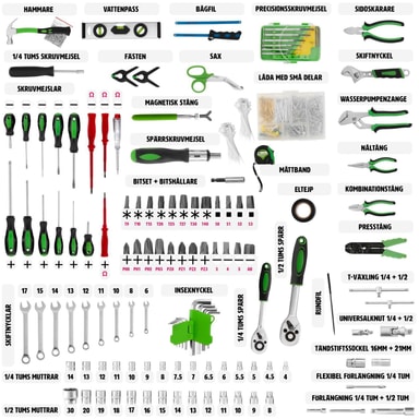 Værktøjskassen leveres fyldt med værktøj, der er fremstillet af højkvalitets krom-vanadium-stål, hvilket sikrer både styrke og lang holdbarhed.