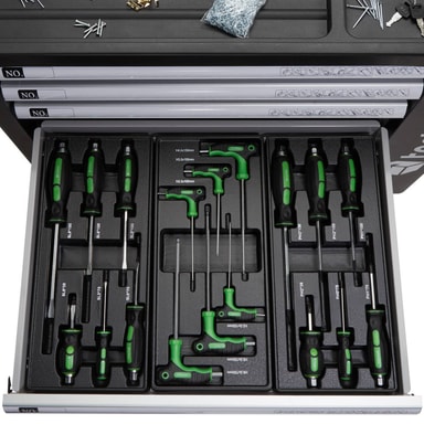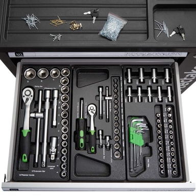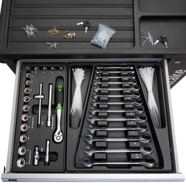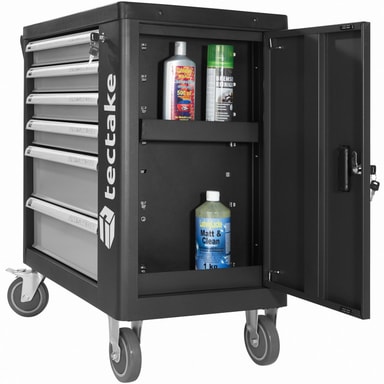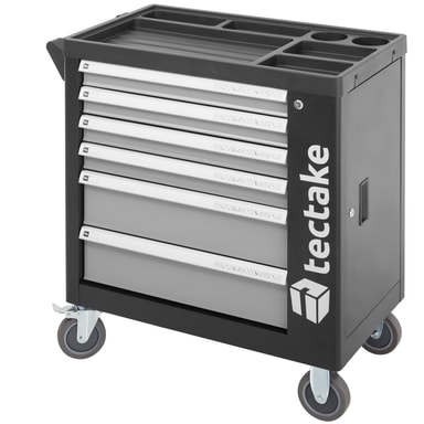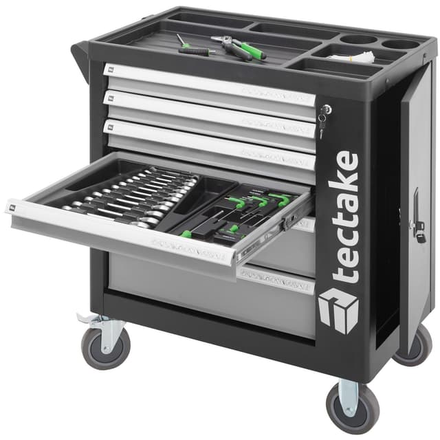 Den alsidige værktøjsvogn fra tectake tilbyder et omfattende udvalg af topnøglesæt, kombinationsnøgler, tænger, skruetrækkere og andet tilbehør. Alle skufferne har et praktisk håndtag og glideskinner så du nemt kan åbne og lukke dem. De store og brede hjul på den behagelige håndvogn garanterer at den står solidt og samtidig har meget høj mobilitet. Takket være det centrale låsesystem er alt indholdet af den robuste monteringsvogn altid beskyttet mod uønsket adgang.