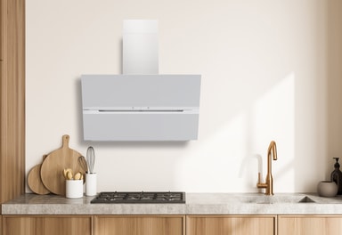 • Vertikal væghængt emhætte i mat hvidt glas og hvidlakeret stål, 90 cm bred