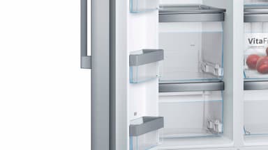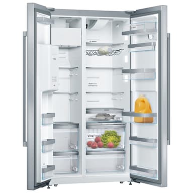 Dette stilrene Bosch series 8 side-by-side kølefryseskab KAD92HI31 opbevarer dine madvarer under de bedste betingelser og har særlige bokse til frugt, grønt og kød foruden is- og vanddispenser, stor rummelighed og mange smarte funktioner.Læs mere om produktet