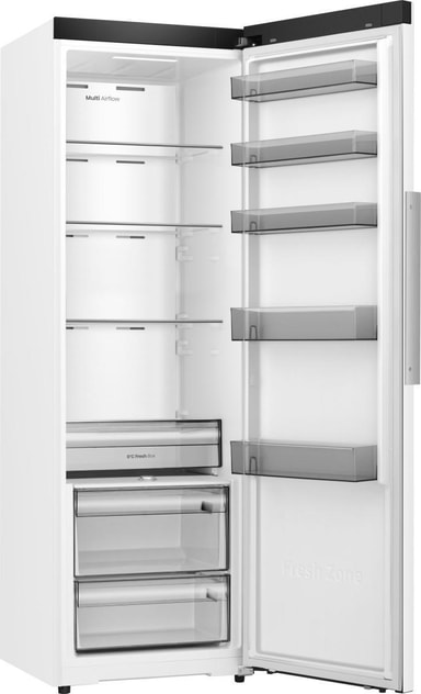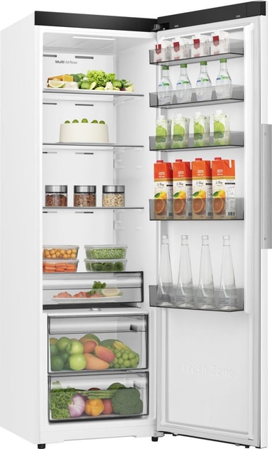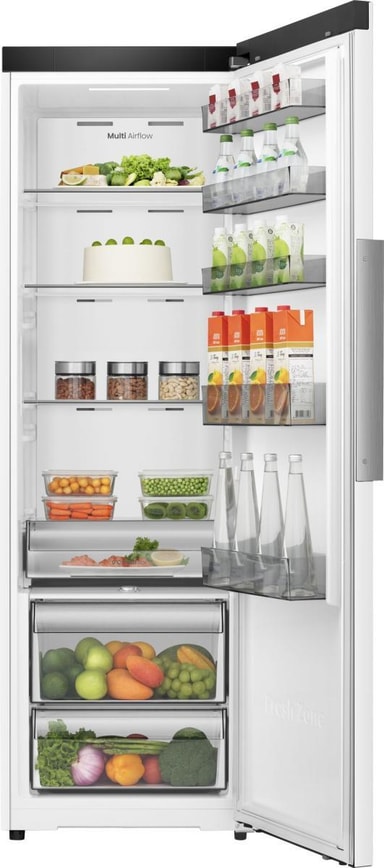 Med en generøs kapacitet på 372 liter har dette køleskab rigelig plads til alle dine dagligvarer. Multi Tray-systemet giver fleksible opbevaringsmuligheder, som gør det nemt at organisere dine madvarer. Fresh Zone er et dedikeret rum, der holder dine frugter og grøntsager friske i længere tid, og de to grøntsagsskuffer omfatter en med fugtighedsregulering, der opretholder det ideelle fugtniveau for dine produkter.