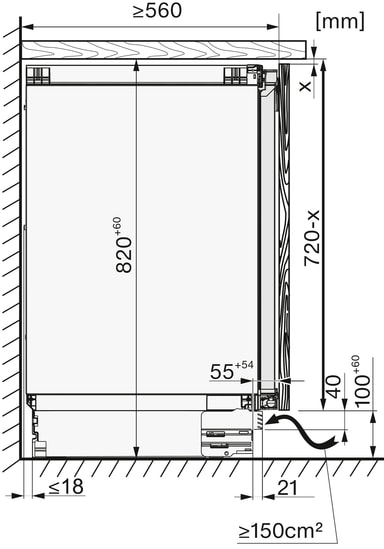 - Kræver køkkenfronter med en minimumshøjde på 72 cm.