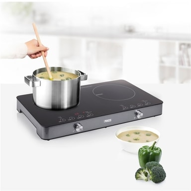 Induktions-kokplattan med dubbla plattor värms upp mycket snabbt och är lätt att hantera. Med sin vackra design smälter den in fint i alla moderna kök. Perfekt för utökning av din befintliga spis eller till husvagnen/sommarstugan.