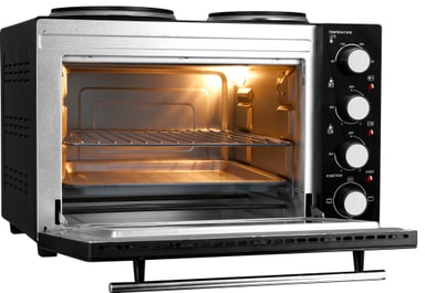 Miniovnen har 2 kogeplader oven på ovnen, som kan bruges samtidig med ovnen.