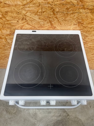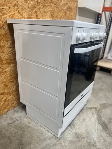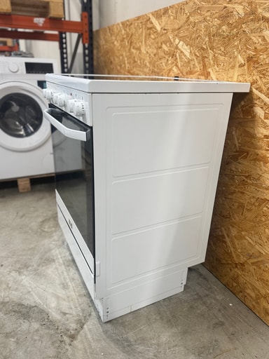Hvidt glaskeramisk komfur med 4 kogezoner, heraf 3 dobbeltzoner. Komfuret betjenes med drejeknapper og ovnrummet har katalytisk selvrens. Ekstra stort ovnrum med markedets største bageplader, magasinskuffe til opbevaring af ovntilbehør samt udtræk i 1 niveau.