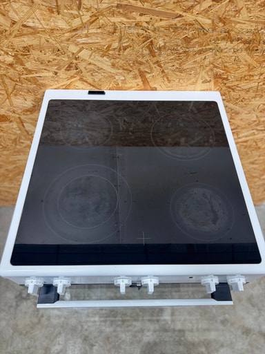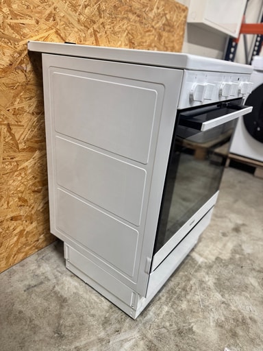 Hvidt Voss glaskeramisk komfur med 4 kogezoner, som betjenes med drejeknapper og ovnrummet har katalytisk selvrens. Desuden ekstra stort ovnrum med markedets største bageplader samt praktisk magasinskuffe til opbevaring af ovntilbehør.