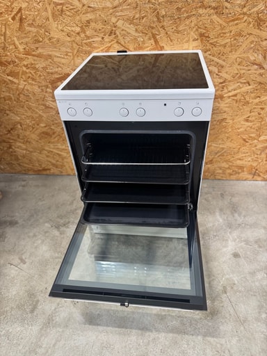 Glaskeramisk komfur 60 cm. med katalyse delvis selvrens: Hvidt glaskeramisk komfur med 4 zoner, heraf 3 dobbeltzoner. Komfuret har rengøringsvenlige pop-ud knapper og ovnen har katalytisk selvrens. Stort ovnrum med markedets største bageplader, praktisk magasinskuffe til opbevaring af ovntilbehør samt udtræk i 2 niveauer.