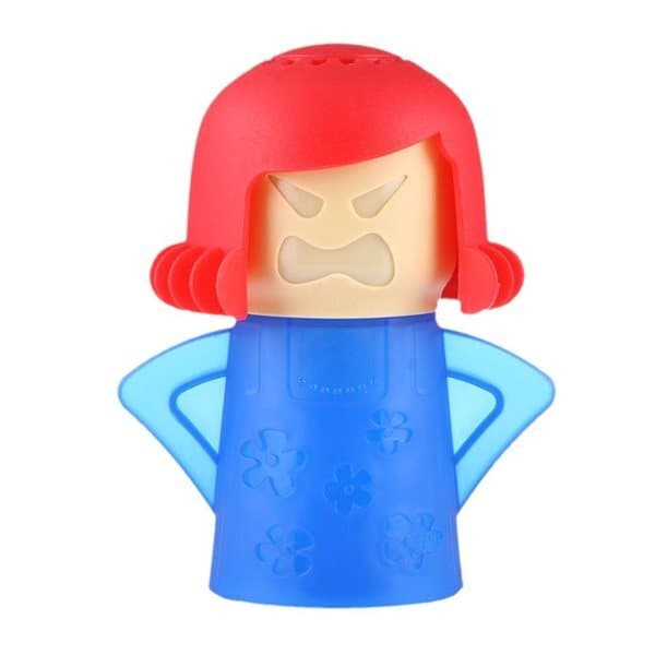 Angry Mama rengør din mikroovn på 7 minutter. Det eneste du skal gøre er at fylde hende med vand og lidt eddike. Når mikroen derefter bipper lader du hende blive stående i 2 minutter hvorefter du har en skinnende ren ovn. Hemmeligheden en den aftagelige frisure, der er fuld af små huller som sprøjter damp ud over mikroens vægge. Varmen og trykket fjerner selv de skrappeste aflejringer og de varmebeskyttede arme gør at du nemt kan løfte hende uden at brænde dig. For at give et ekstra rent resultat kan det resterende eddike-vand hældes i en vaskesvamp for et give mikroen en sidste omgang.