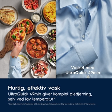 UltraQuick 49min er et mere energivenligt* og kraftfuldt program, som er optimeret til tøjvask i hverdagen. Det fjerner alle pletter fra dit vasketøj med blandede tekstiler, som bomuld og syntetiske materialer, ved lave temperaturer (30°C) og på kort tid (49 min.).** 1. *Baseret på ekstern test af pletfjernelse på 50 almindelige husholdningspletter med programmet UltraQuick 30°C og en mængde på 5 kg. **Baseret på intern test, der sammenlignende bomuldsprogrammets energiforbrug ved 40°C med UltraQuick programmet på 49 min. ved 30°C 2. *Baseret på intern test, der sammenlignede energiforbruget for bomuldsprogrammet ved 40°C med UltraQuick programmet på 49 min. ved 30°C. **Baseret på ekstern test af pletfjernelse på 50 almindelige typer husholdningspletter med UltraQuick-programmet ved 30°C og en mængde på 5 kg