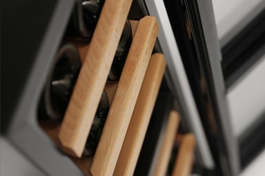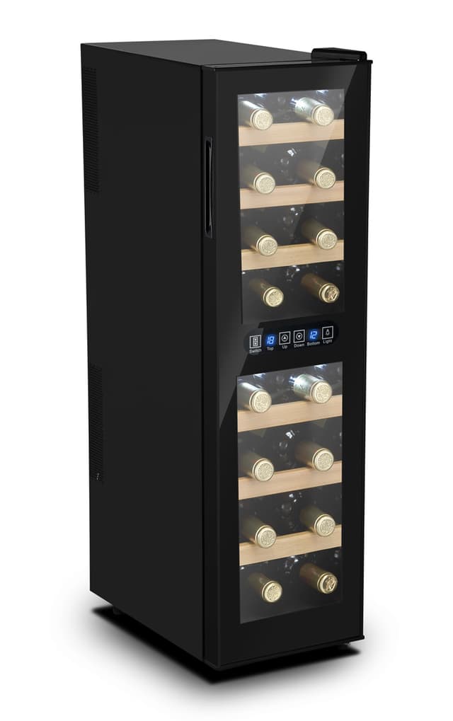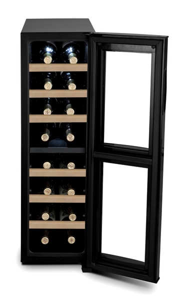 Dette køleskab er perfekt til det stilfulde hjem. Med detaljer som træhylder, led-belysning og touch-screen giver det en luksuriøs fornemmelse, og det er et meget prisvenligt vinkøleskab! Vinkøleskab har en lav vibration med peltier-teknologi og har plads til 16 flasker.