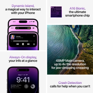 iPhone 14 Pro smartphonen tilbyder en smuk 6,1” OLED-touchskærm med en variabel 120 Hz opdateringshastighed, en kraftfuld A16 Bionic-processor med 5G-dataforbindelse og en industriledende IP68-vandresistens.Læs mere om produktet