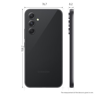 *Galaxy A54 5G er IP67-klassificeret. Baseret på laboratorietestforhold ved nedsænkning i ferskvand til en dybde af op til 1 meter i op til 30 minutter. Anbefales ikke til brug på stranden eller ved pools. Enhedens støv- og vandafvisende egenskaber er ikke permanente og kan forringes med tiden.