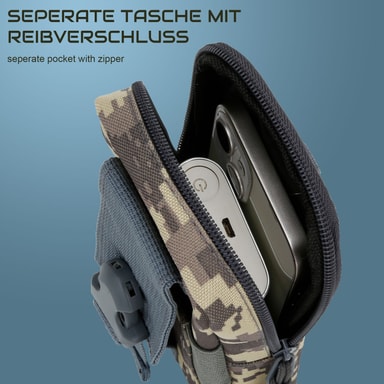 Molle-stroppen på bagsiden giver fleksible muligheder for at fastgøre tasken til et bælte, en rygsæk eller en vest. Den medfølgende skulderrem giver yderligere mulighed for at bære tasken. Denne alsidighed gør tasken til en uundværlig følgesvend.