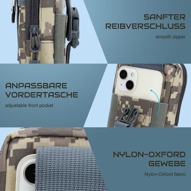 Cadorabos taktiske mobiltaske i camouflage er perfekt til udendørsentusiaster. Med en højde på 185 mm og en bredde på 125 mm giver den plads til smartphones på op til 6,7 tommer. Den er ideel til vandreture, camping, jogging og andre udendørs aktiviteter og holder dine vigtigste ting sikre og lige ved hånden.