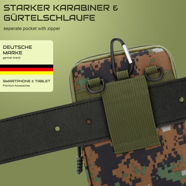 Cadorabos taktiske mobiltaske i camouflage er perfekt til udendørsentusiaster. Med en højde på 185 mm og en bredde på 125 mm giver den plads til smartphones på op til 6,7 tommer. Den er ideel til vandreture, camping, jogging og andre udendørs aktiviteter og holder dine vigtigste ting sikre og lige ved hånden.