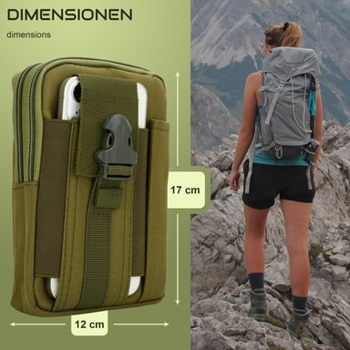 Molle-stroppen på bagsiden giver fleksible muligheder for at fastgøre tasken til et bælte, en rygsæk eller en vest. Den medfølgende skulderrem giver yderligere mulighed for at bære tasken. Denne alsidighed gør tasken til en uundværlig følgesvend.