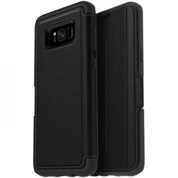 Mjukt läderfolio omsluter telefonen och skyddar skärmen när fodralet är stängt.