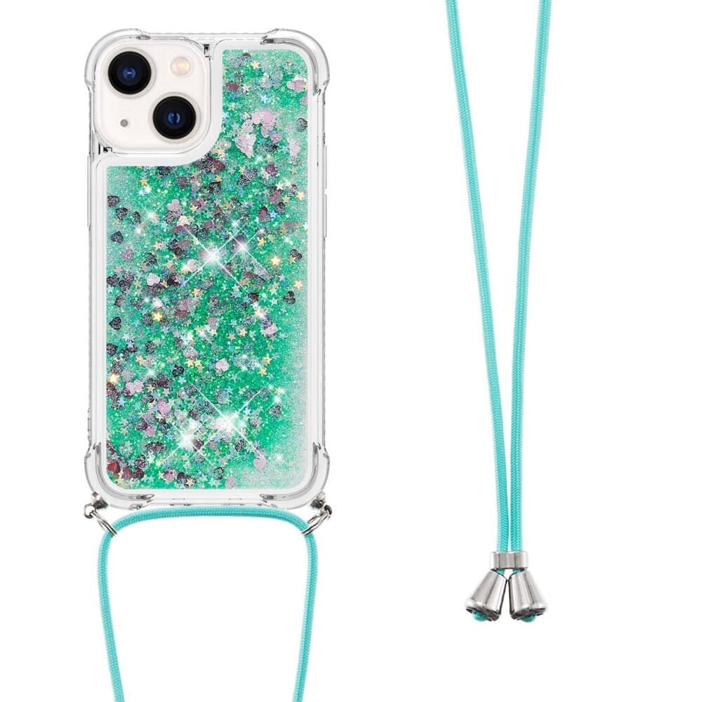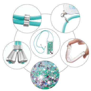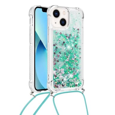 En TPU-cover med en håndrem. Skallen er fyldt med væske med glitter. Skallen beskytter godt mod stød og fald.