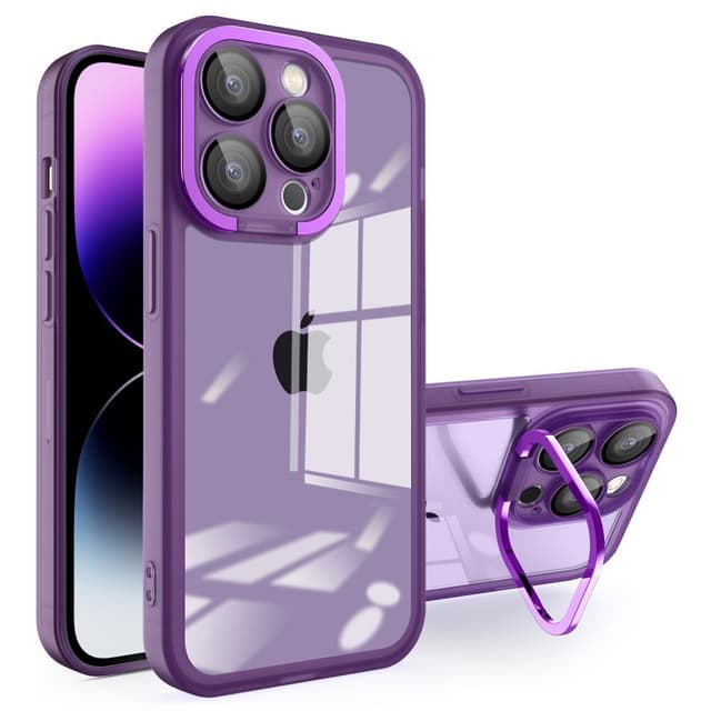 Et stilfuldt etui med en farvet TPU-ramme og en stilfuld metalring omkring kameraet, der kan bruges som stativ.