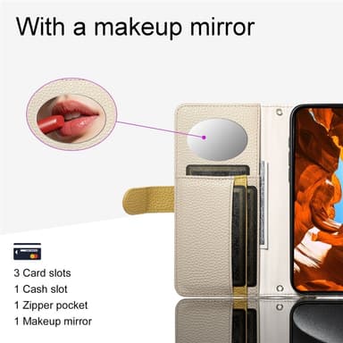 ESEBLE E11 Litchi Mirror er et elegant og funktionelt mobilcover fremstillet af PU-læder med litchistruktur og et slidstærkt TPU-indre, der giver effektiv beskyttelse mod stød. Coveret har tre kortlommer, en kontantlomme, en lynlåslomme samt et indbygget sminkespejl i akryl – perfekt til daglig brug. Det indbyggede stativ muliggør håndfri visning i forskellige vinkler, hvilket gør det ideelt til videoer, læsning eller videosamtaler. Coveret giver fuld beskyttelse med forhøjede kanter omkring skærm og kamera. Den medfølgende håndledsrem giver ekstra sikkerhed og komfort under brug.