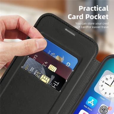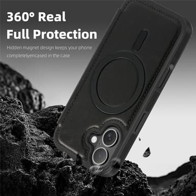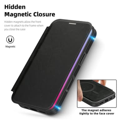 Denne elegante skal giver perfekt beskyttelse med indbyggede magneter. Problemfri MagSafe-kompatibilitet giver hurtig trådløs opladning hver gang. Skallen er lavet af slidstærkt TPU og stilfuldt PU-læder. Praktiske kortspor rummer nemt dit ID eller kreditkort. RFID-blokerende teknologi beskytter dine personlige oplysninger sikkert. Hævede kanter beskytter skærm og kamera effektivt.