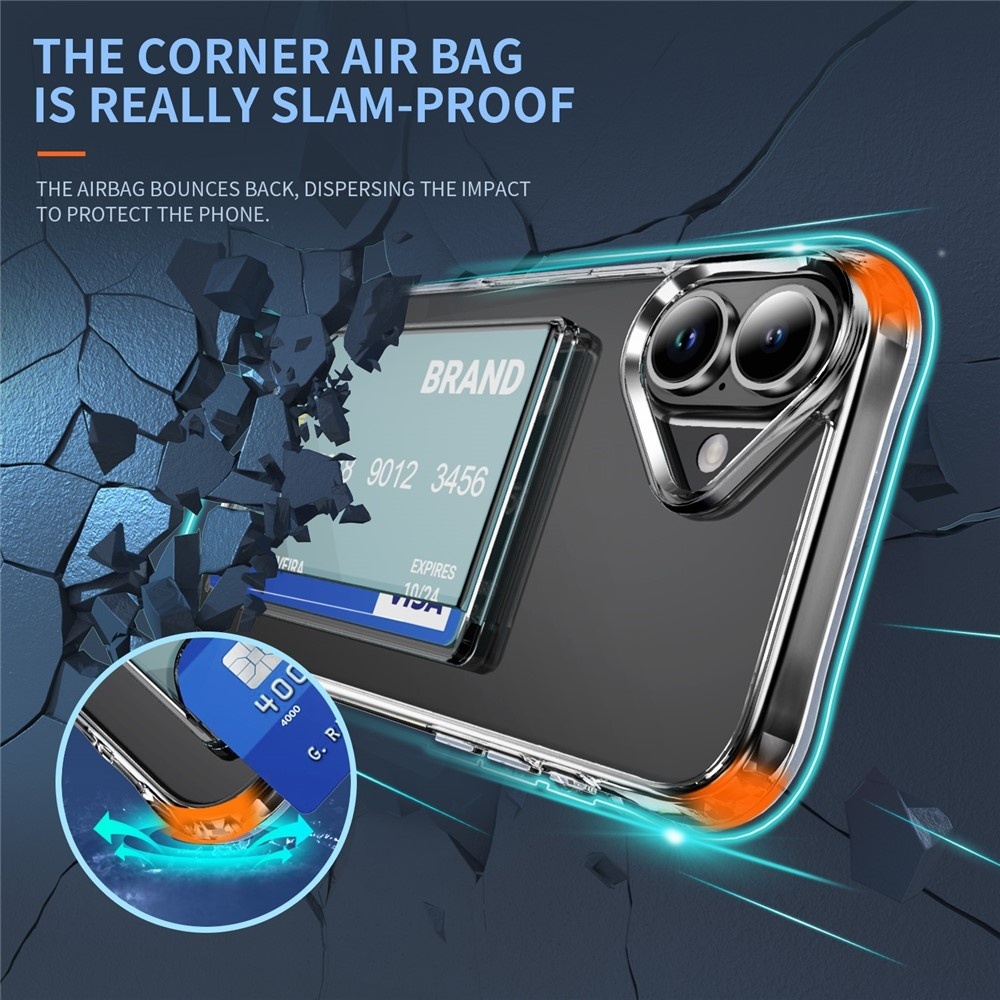 Dette TPU-cover kombinerer stilren gennemsigtighed med praktisk funktionalitet. Det er fremstillet til at være holdbart og modstandsdygtigt over for gulning, samtidig med at det giver pålidelig beskyttelse ved fald. Hævede kanter omkring kamera og skærm beskytter mod ridser og skader. Med præcise udskæringer får du fuld adgang til alle porte og funktioner. På bagsiden findes en indbygget kortlomme, der sikkert kan rumme op til to kort. Coveret er let at montere og fjerne, og dets slanke design gør det behageligt at have i lommen.