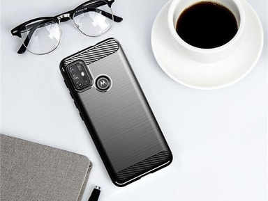 En stødsikker Armor Carbon-cover i TPU med et stilfuldt kulfiberlook.