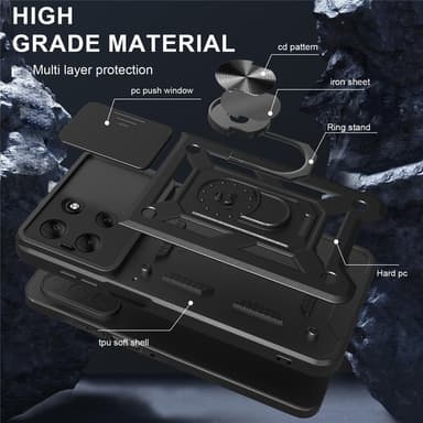 Oplev ultimativ beskyttelse og funktionalitet med Armor Metal Ring Kameraskyder. Dette cover er designet til at give din telefon et elegant udseende, samtidig med at det beskytter mod hverdagens udfordringer. Den indbyggede roterbare ring gør det nemt at bruge telefonen med én hånd og justere betragtningsvinklen, mens den magnetiske holders kompatibilitet sikrer stabil placering i bilen.