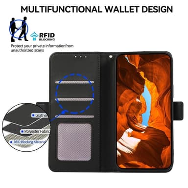 Dette stilfulde cover i PU-læder og TPU-materiale giver holdbar beskyttelse til din enhed. Indbygget RFID-blokeringsteknologi beskytter dine personlige oplysninger mod uautoriseret scanning. Den praktiske pungdesign har plads til kort og kontanter, så du nemt kan have det vigtigste med dig. Coveret kan også foldes til et stativ for komfortabel, håndfri visning. Den stærke magnetlukning holder telefon og kort sikkert på plads.