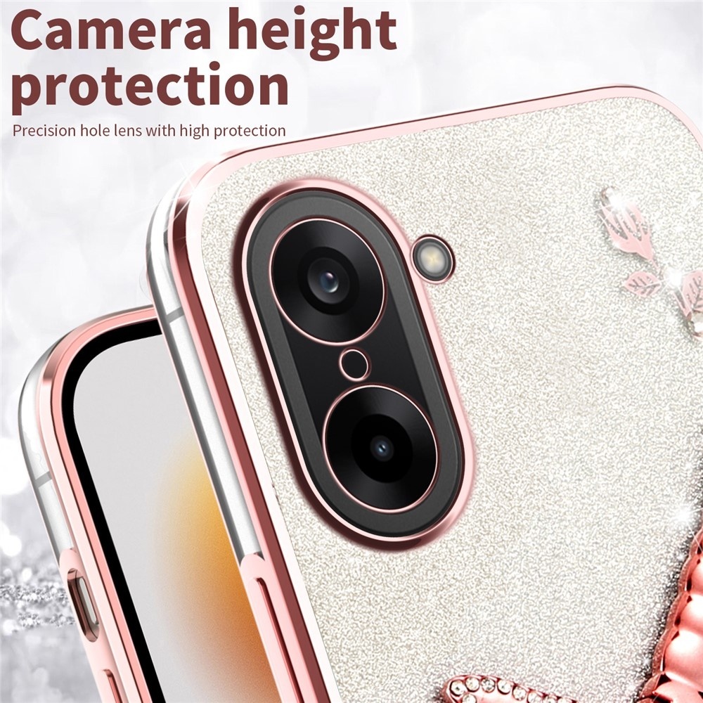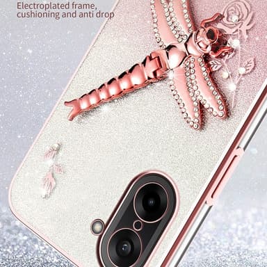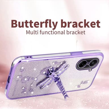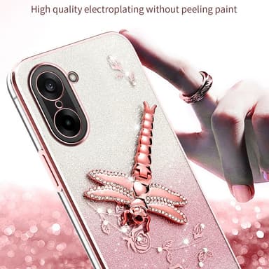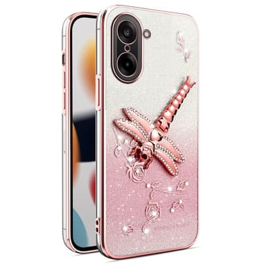 Giv din telefon et touch af elegance med dette KADEM Dragonfly Glitter cover. Det glitrende cover med indbygget stativ giver både stil og funktion. Nyd handsfree-visning med det praktiske stativ, mens det smukke design med evighedsblomst og rhinsten løfter din telefons udseende.