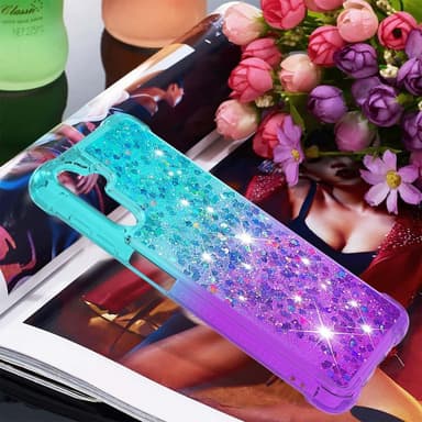 En TPU-cover med flydende væske med glitter og hjerter, der beskytter godt mod stød og faldskader.
