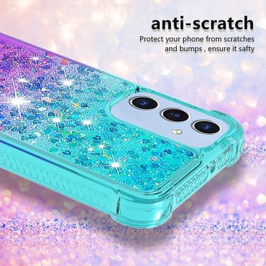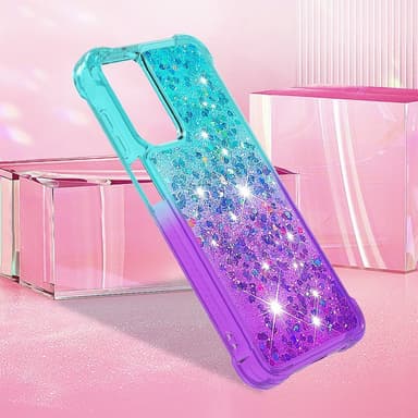 En TPU-cover med flydende væske med glitter og hjerter, der beskytter godt mod stød og faldskader.