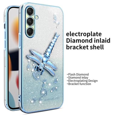 Giv din telefon et touch af elegance med dette KADEM Dragonfly Glitter cover. Det glitrende cover med indbygget stativ giver både stil og funktion. Nyd handsfree-visning med det praktiske stativ, mens det smukke design med evighedsblomst og rhinsten løfter din telefons udseende.