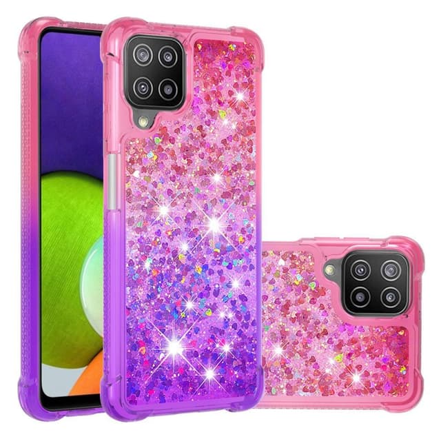 En TPU-cover med flydende væske med glitter og hjerter, der beskytter godt mod stød og faldskader.