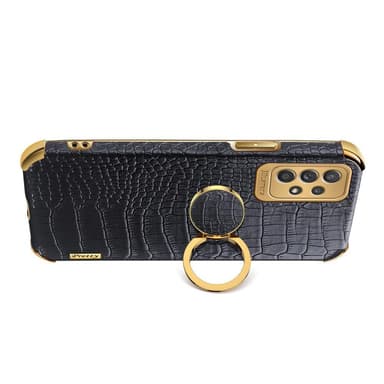 Krokodille-mønstret PU-lædercover med gulddetaljer. Ringen på bagsiden kan løsnes med forud monteret dobbeltklæbende tape.