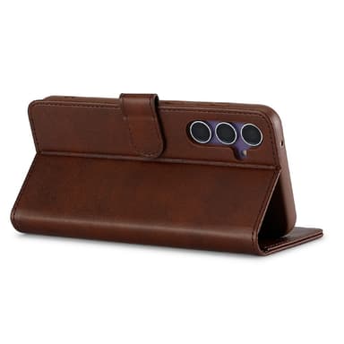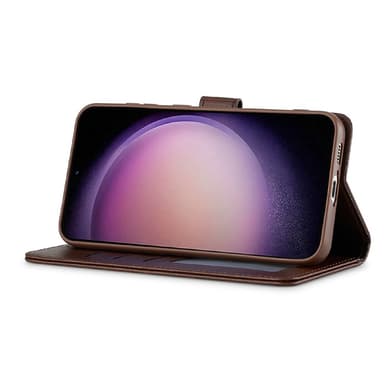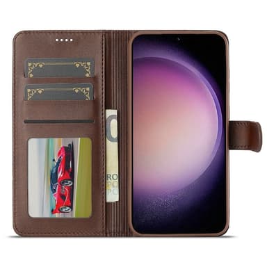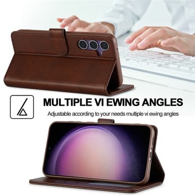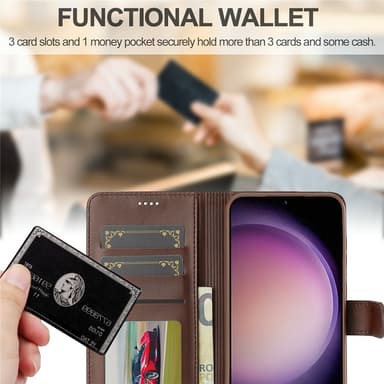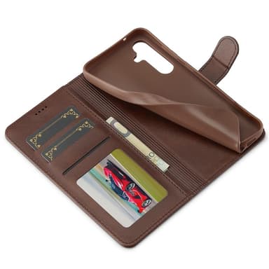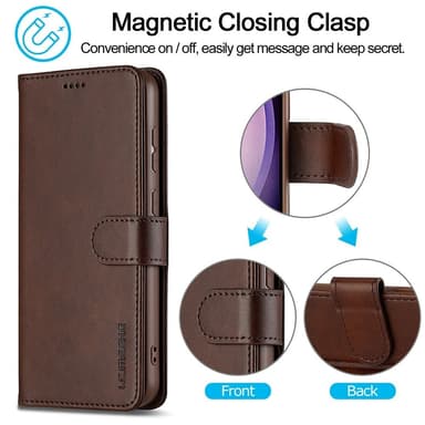 Dette stilfulde cover er fremstillet af PU-læder med kalvestruktur og TPU-materiale, hvilket giver en blød fornemmelse og elegant finish. Det giver 360 graders beskyttelse og kombinerer funktionalitet med æstetik. Med to kortlommer, en fotolomme og et kontantrum kan du lade pungen blive hjemme. Det foldbare stativ giver justerbare vinkler til håndfri visning, og den stærke magnetlukning holder telefon, penge og kort sikkert på plads. Et reserveret hul til højtaleren gør det muligt at tale med coveret lukket.